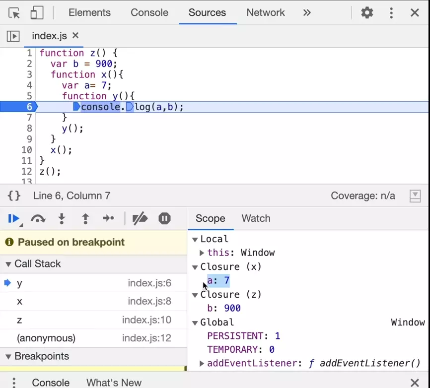You can see in the above image, the scope of the function "y" has closure and in that closure, it has a variable "a" with value 7. And also it has a global reference which is the reference of its parent's lexical environment.